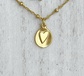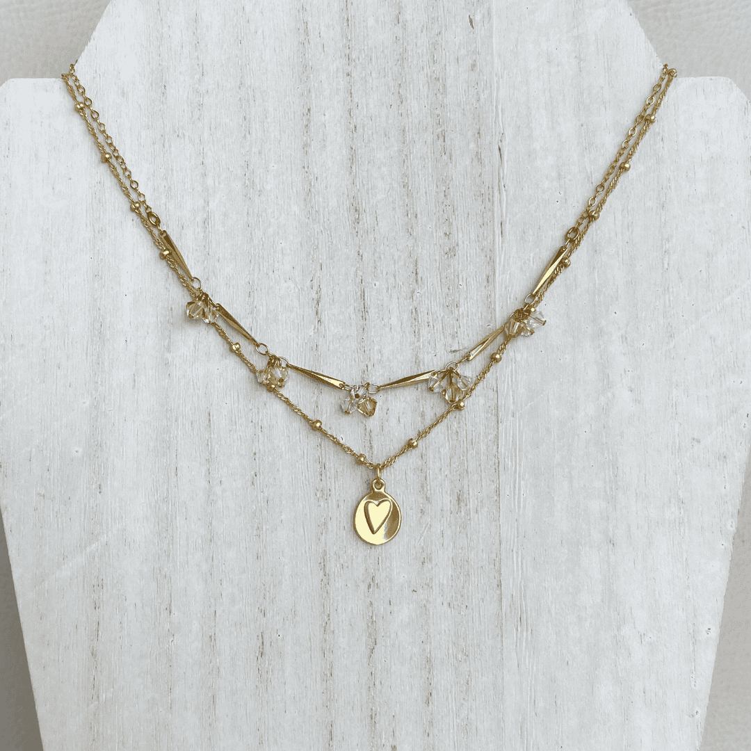 A brushed matte gold charm with an embossed heart on a 17” satellite beaded chain.