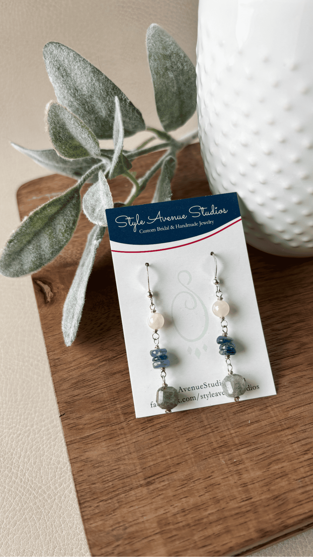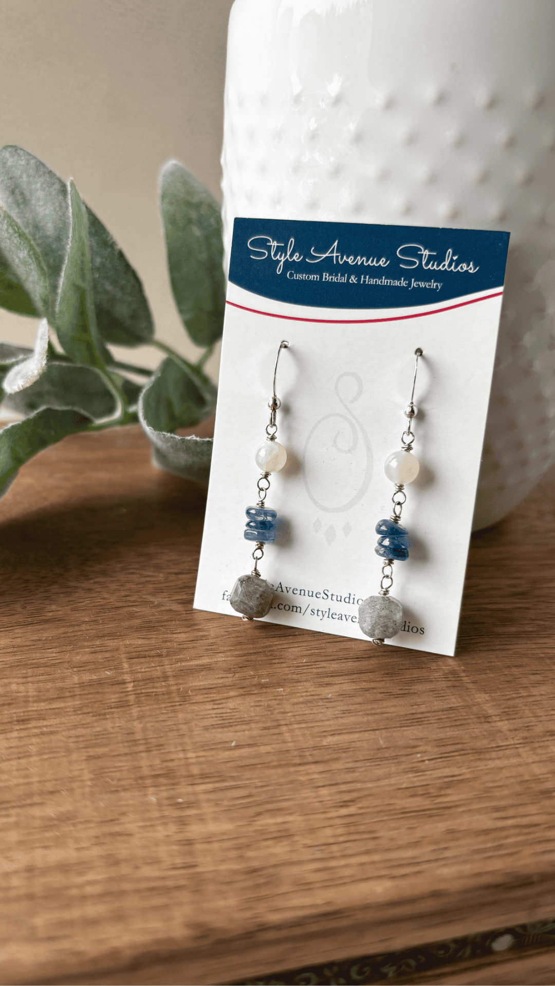 A labradorite cube adds subtle blue light flashes that accent the blue kyanite rondelles, and the milky moonstone completes the design. Each stone is linked with sterling silver, allowing natural movement and an easy, balanced feel.