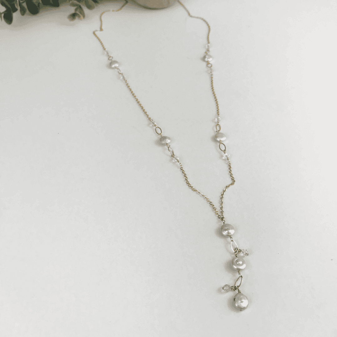 Whether you are looking for a unique bridal necklace or something delicate yet interesting to go with your wardrobe, you FOUND IT! This long and delicate necklace features coin pearls and swarovski crystals and a simple tassel of pearls and crystals.