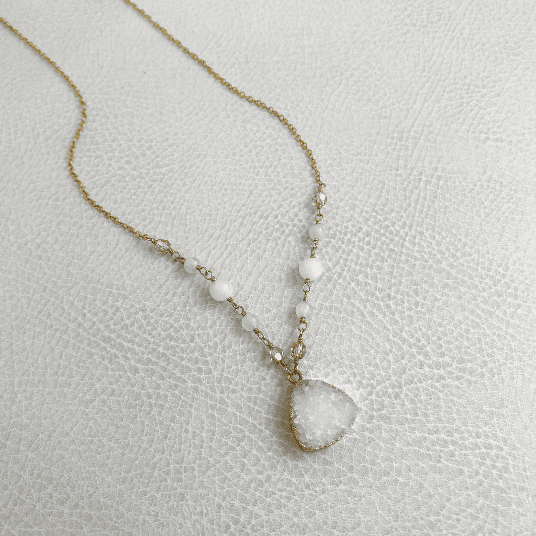 This White Druzy Pendant Necklace is a lovely addition to your professional wardrobe and still be able to sport your love of druzy stones and moonstone.